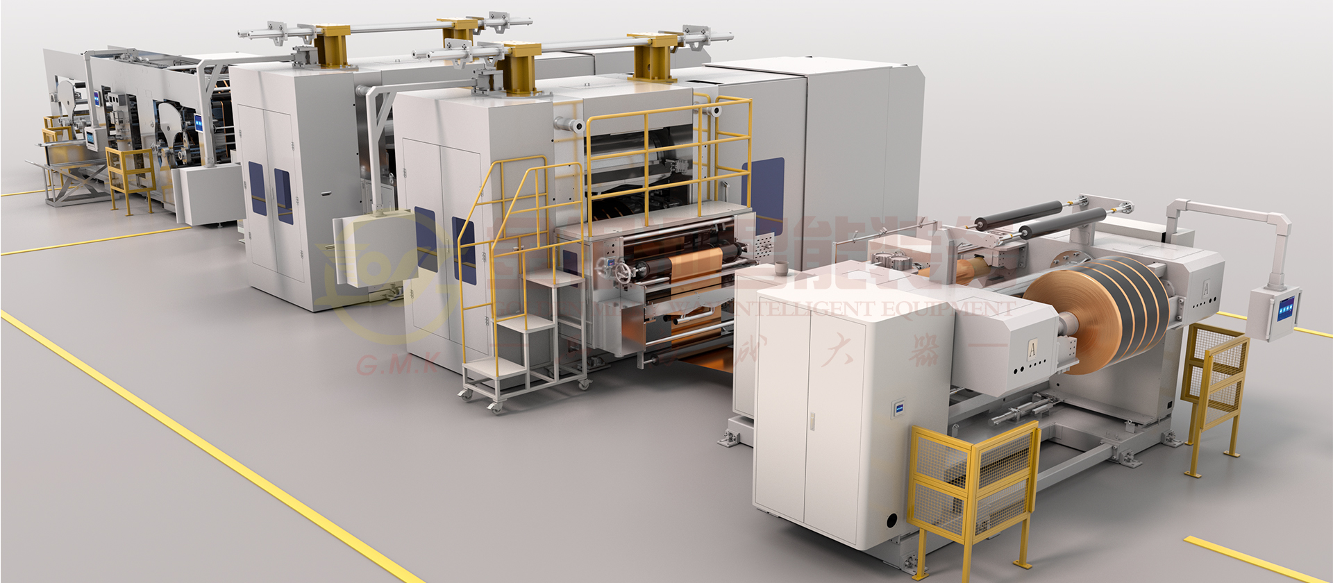 ●輥壓分切一體機,將輥壓功能與分切功能合並,省去了輥壓的收卷裝置,同樣的道理,也省去了分切的放卷裝置,減少操作員工,縮短了傳動鏈,產品質量穩定,減少損耗,良品率提高。